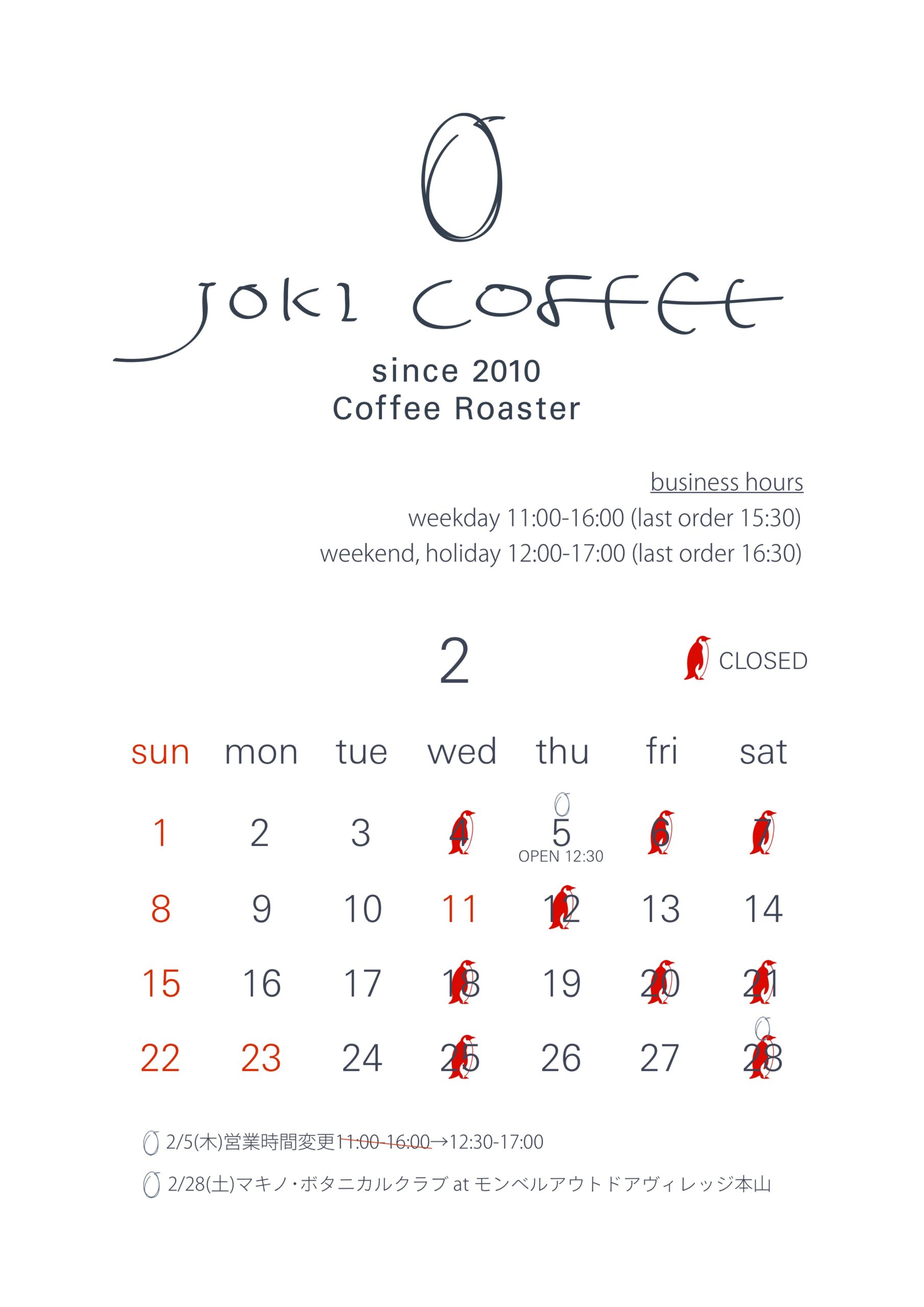 2月の営業カレンダー更新しました。 2/5(木)は都合により営業時間を12:30-17:00に変更して営業します。 2/28(土)は牧野植物園主催の講座「本で巡る世界の旅 コーヒーとカカオを繙く」に 講師として出席します。(場所:モンベルアウトドアヴィレッジ本山) それに伴い2月のコーヒー教室はお休みします。 コーヒー豆ご希望の方はオンラインストアでお買い求めいただけます。 店舗ではテイクアウトメニューもご用意していますのでご活用ください。 ✴︎その他、臨時休業など営業変更の場合は事前にお知らせいたします。